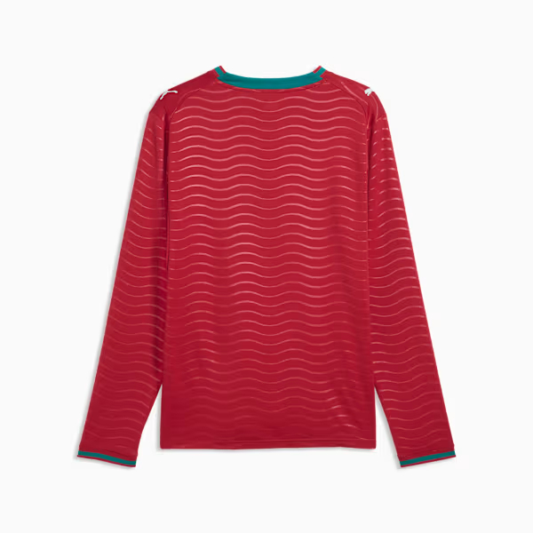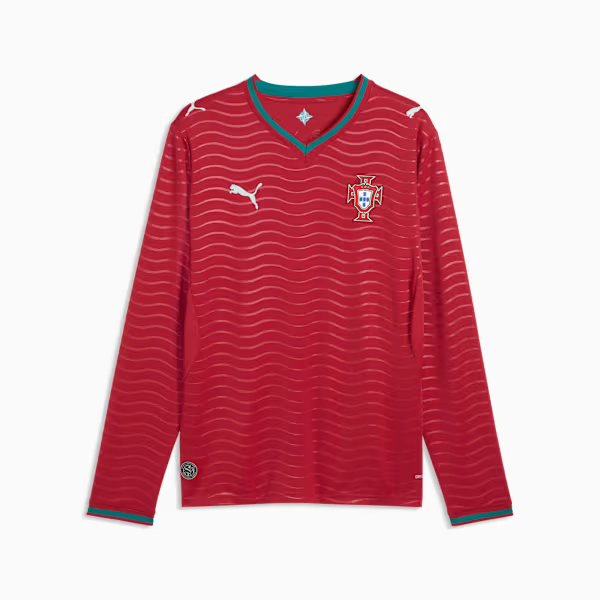 Portugal’s Home Jersey reflects the power of the ocean and the intensity of a team built to challenge the world. The classic red base is layered with a bold wave-inspired graphic and sharp green accents, honoring Portugal’s seafaring heritage and unstoppable competitive spirit.